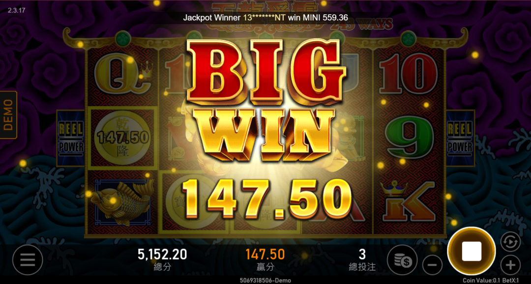 - 所有贏分組合會乘上投注倍數和每一轉輪上出現贏分符號的數量。