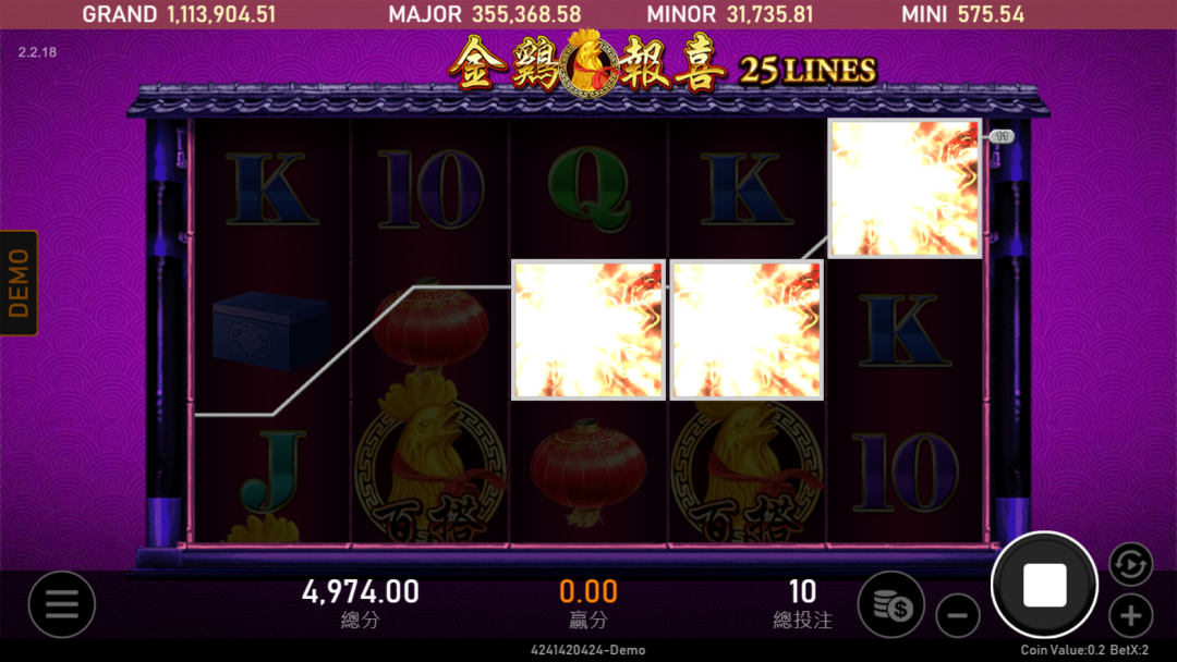 《金雞報喜》是一款25線老虎機遊戲,有百搭符號,免費自由旋轉觸發後,中獎倍數和紅利倍數急劇增加,最高紅利倍數可達數369萬倍,俗話說信金雞,就有奇蹟。